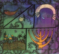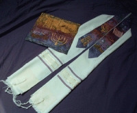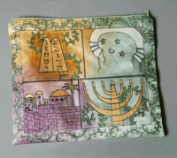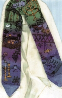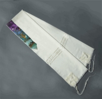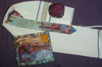 Atarot and tallit are created using symmetrically hand-dyed silk so that when worn, the color is consistent throughout. The design is then drawn on the silk with a fine fabric pen and painted in many layers with fabric paint. The atarah can be personalized with a Hebrew name at the neck portion. Finally, the atarah is sewn on a wool crepe tallit that is embellished with the colors of the atarah in the striping.